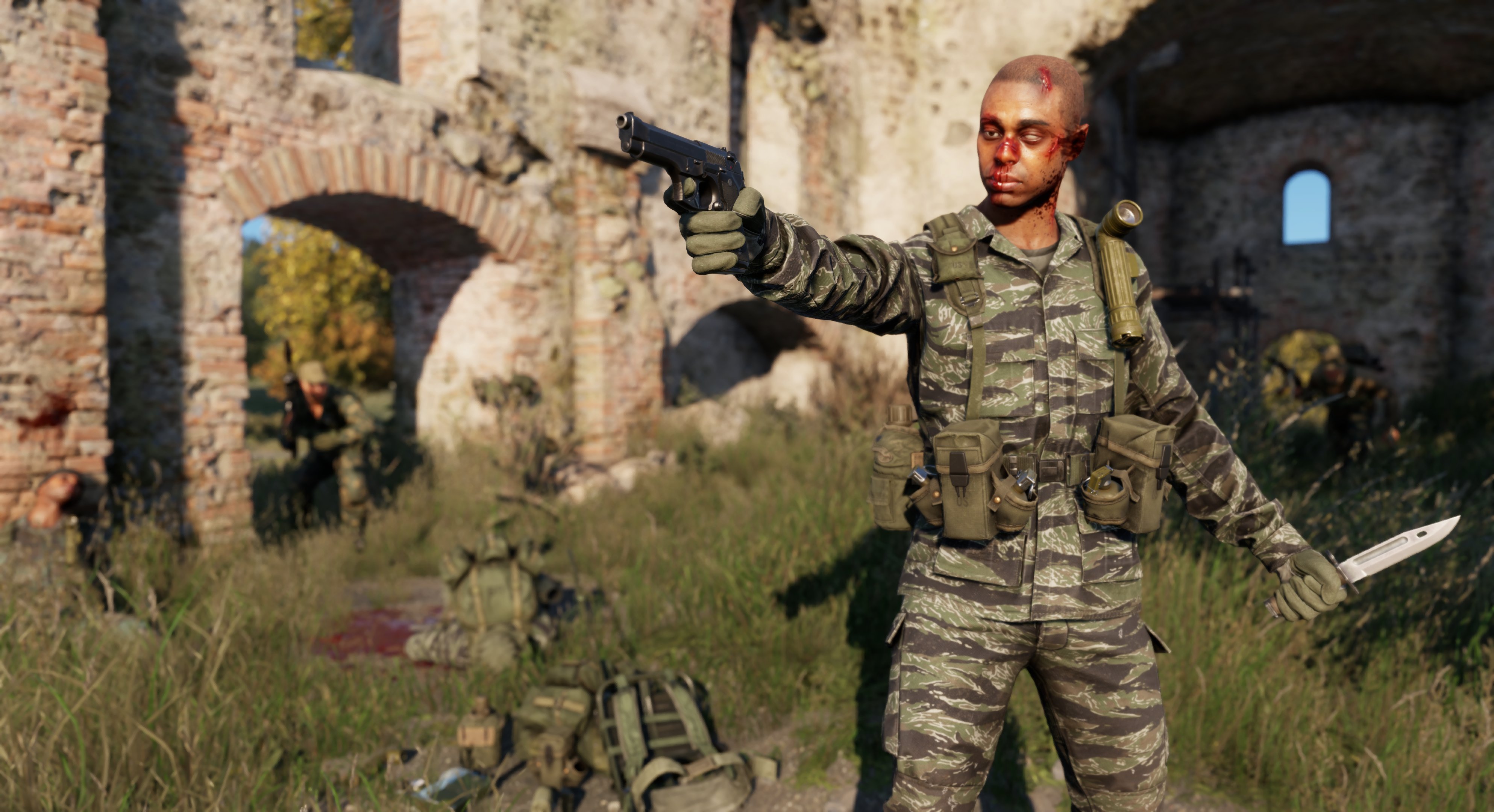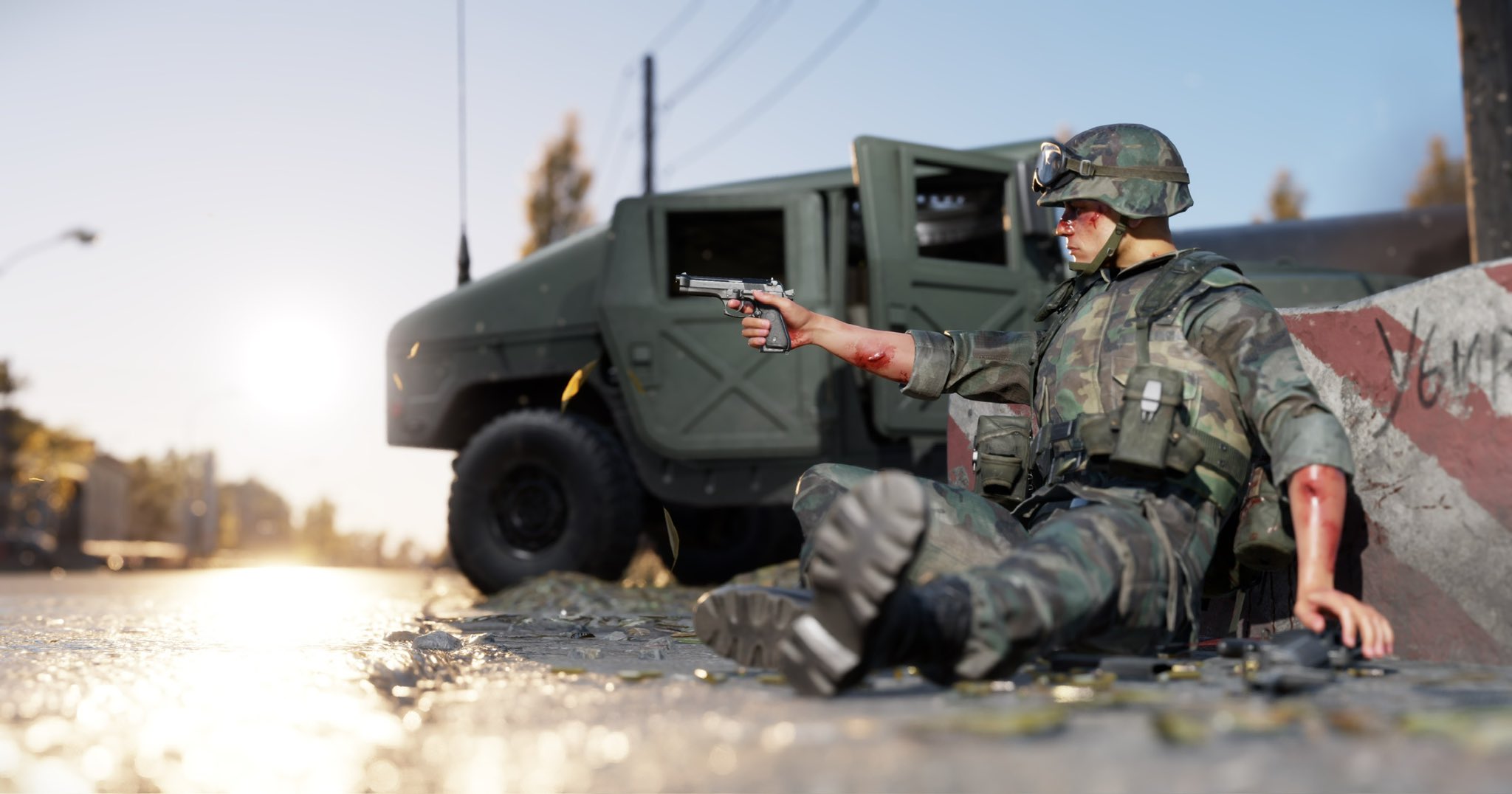 DriftyTime, also known as Kae, is another well-known name to the Arma photographic community. This image very nicely blends the worlds of Reforger and DayZ, with a US Special Forces soldier most likely fighting his last battle yet unwilling to give up. Great use of injured facial textures and decals. Props for making sure nothing clips and everything fits the scene well. The M67 grenades in their pouches are a neat little detail!