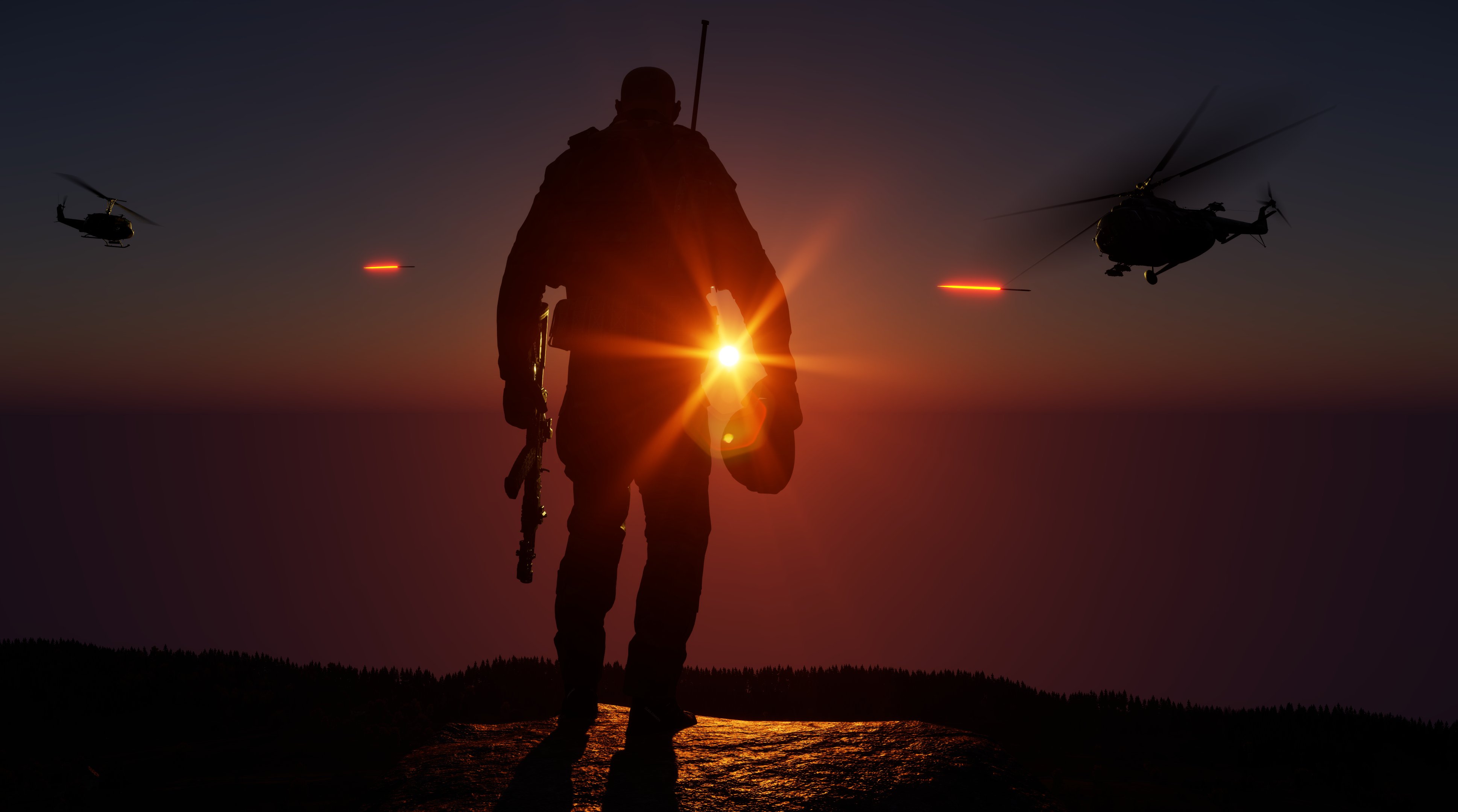 Moody, dark, yet epic, and beautiful. This sunset scene by Azzey utilises lighting and lens flares perfectly. Using tracers as trails for the UH-1H rockets is certainly an unorthodox choice, but not entirely out of place. Props for creativity for that one. Definitely wallpaper material.