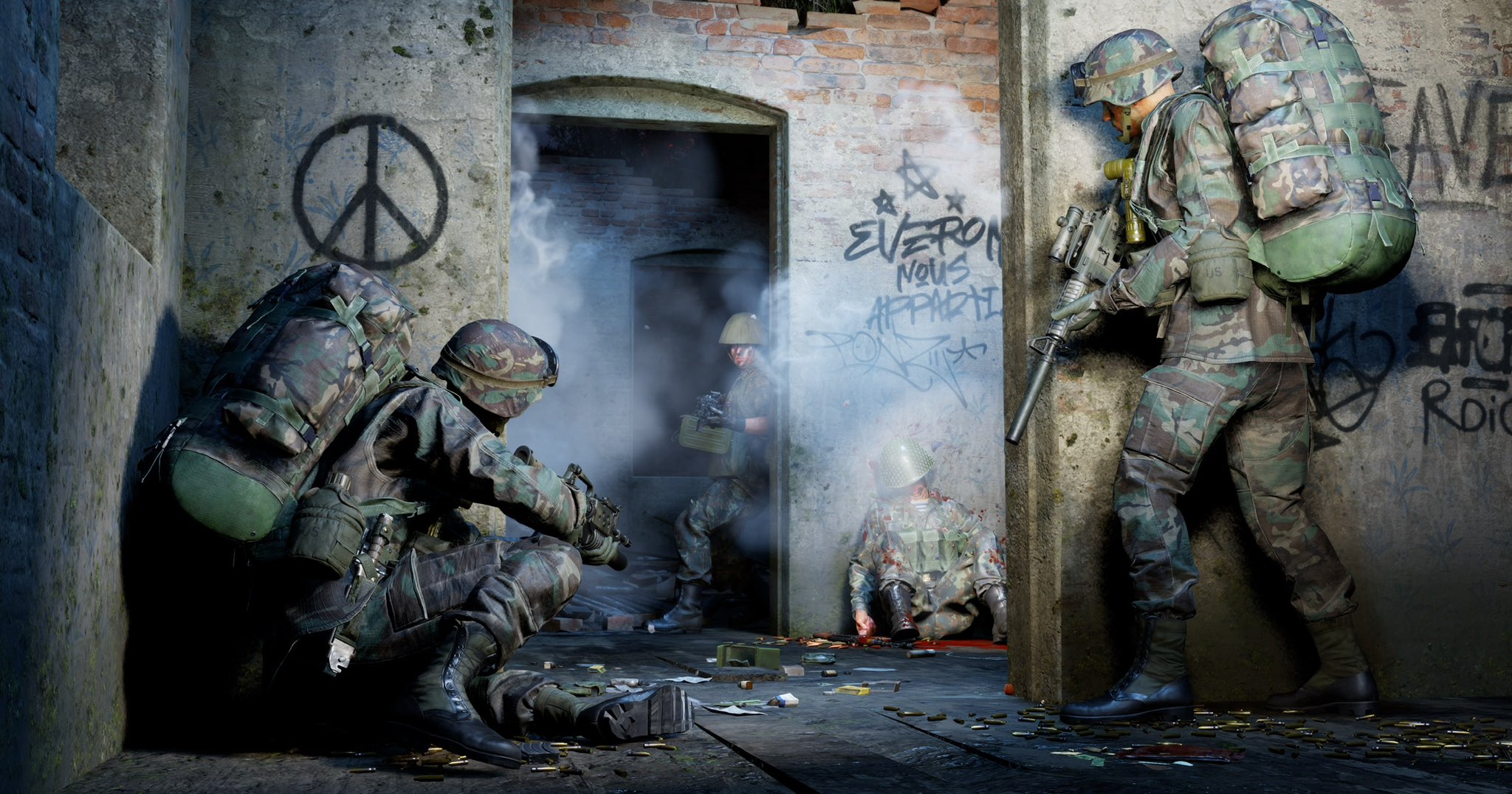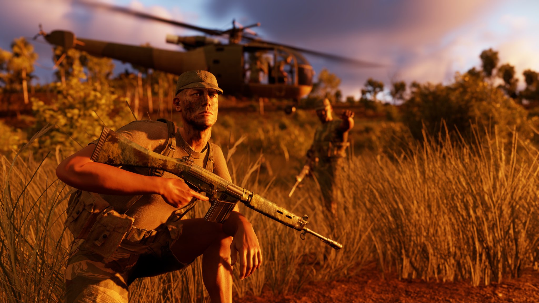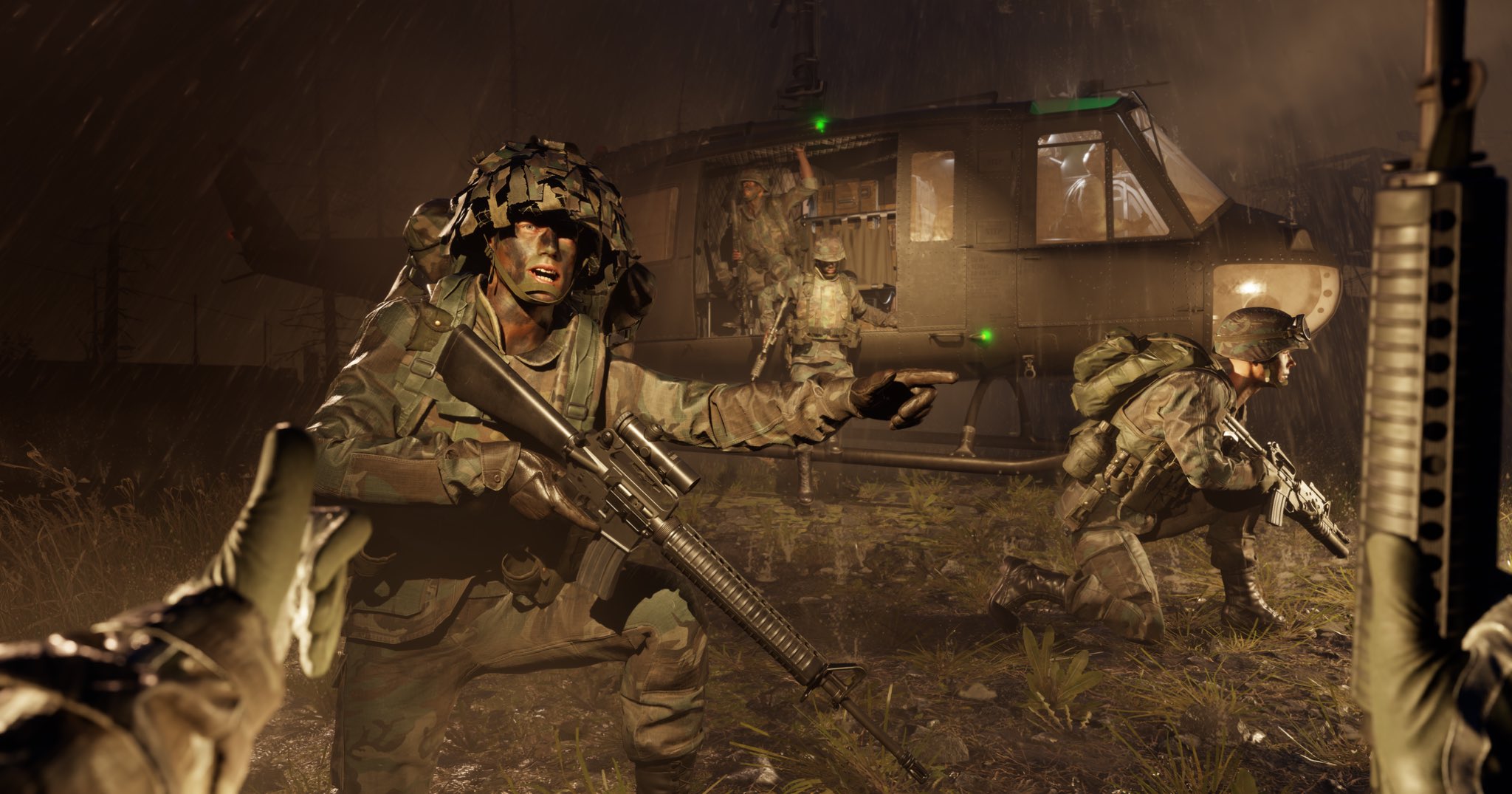The first image is very reminiscent of Captain Miller's last stand in Saving Private Ryan. Beautiful use of depth of field and sunlight. The second shot is an intense helicopter dismount from the eyes of one of the troops, with a nice utilization of animations and custom bone manipulations.