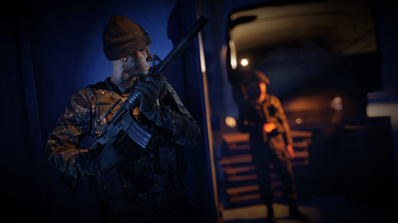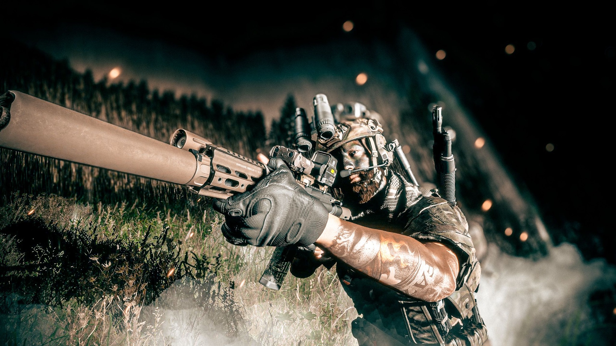 An epic operator showcase created by Chris Quinn, including some sleeve tattoos, a beard, a modern loadout, and very interesting color grading. A truly epic image.
