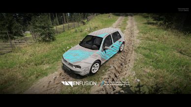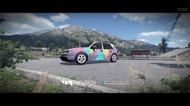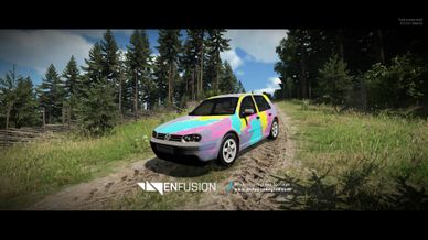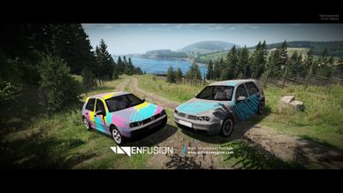 Two textured civilian vehicle, one with rainbow splash wrap and the other with a race blue wrap.