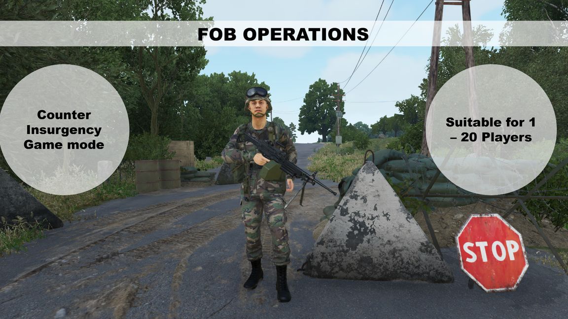 FOB Operations in a cooperative counter insurgency game mode, based loosely on the old Insurgency mission for Arma 2. The FIA have turned against NATO forces and have launched an insurgency campaign against them. As Everon is a crucial naval base, NATO are determined to bring a swift end to the insurgency.