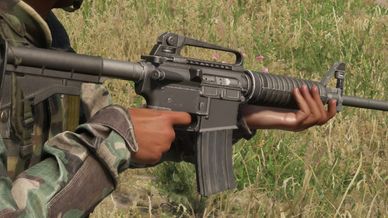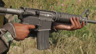 Has a detachable carry handle for putting on optics and wrapped on flashlight. ACOG detaches from carry handle as well. Other optics work on the carry handle as well as the main receiver's rail if the carry handle is taken off. Carry Handle sight also works.