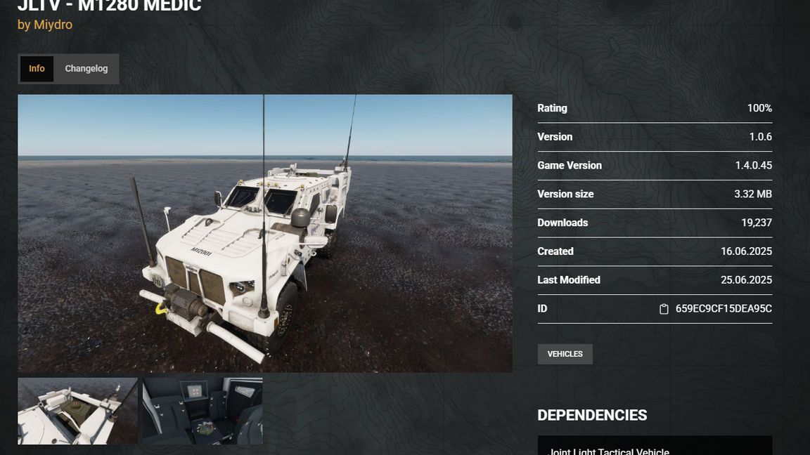 Simple fix for the JLTV Medic, added the heal componant. Thanks to Miydro for making the MOD. Unfortunatly he had no link to post for suport. Thanks to Space Strider for the JLTV MOD please suport him on Patreon at patreon.com/SpaceStrider!