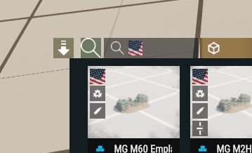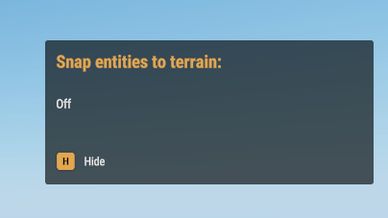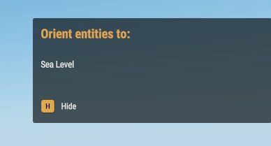 - Arrow button - Snap entities to terain toggle: ON - OFF - Magnifying glass button - Orient entities to: Sea ground - Terrain level - Geometry. Each button has, on mouse hover tooltips and on click message to show what setting is now set. *Does not work with controllers atm, only KBM*